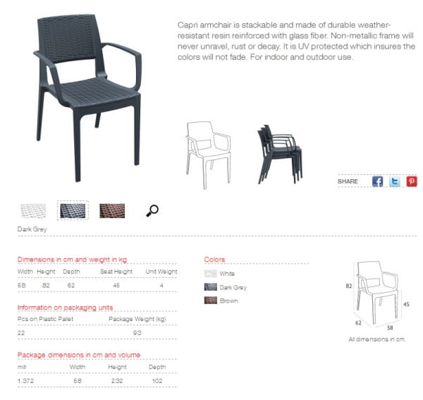 Kolekcja zawiera krzesła, stoły oraz cale zestawy mebli przeznaczonych do każdego wnętrza, zaczynając od jadalni poprzez restauracje a kończąc na ogrodach. Dzięki różnorodności oraz funkcjonalności mebli, można stworzyć swój własny zestaw, najbardziej odpowiadający potrzebom. Marka Siesta oferuje szeroki asortyment produktów wykorzystywanych do aranżacji wnętrz jak i na zewnątrz budynków. Kolekcja przyciąga bogata kolorystyką, funkcjonalnością, niepowtarzalnymi kształtami a dzięki materiałom, z których są wykonane pasują równie dobrze do stylowych wnętrz jak i nowoczesnego apartamentu