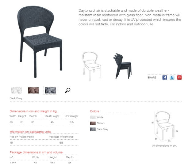 Krzesła Daytona Siesta wykonane z wytrzymałego materiału imitującego technorattan - jednolity odlew z wysokiej jakości tworzywa. Krzesła odporne na warunki atmosferyczne, łatwe w składowaniu przez sztaplowanie oraz w utrzymaniu czystości.