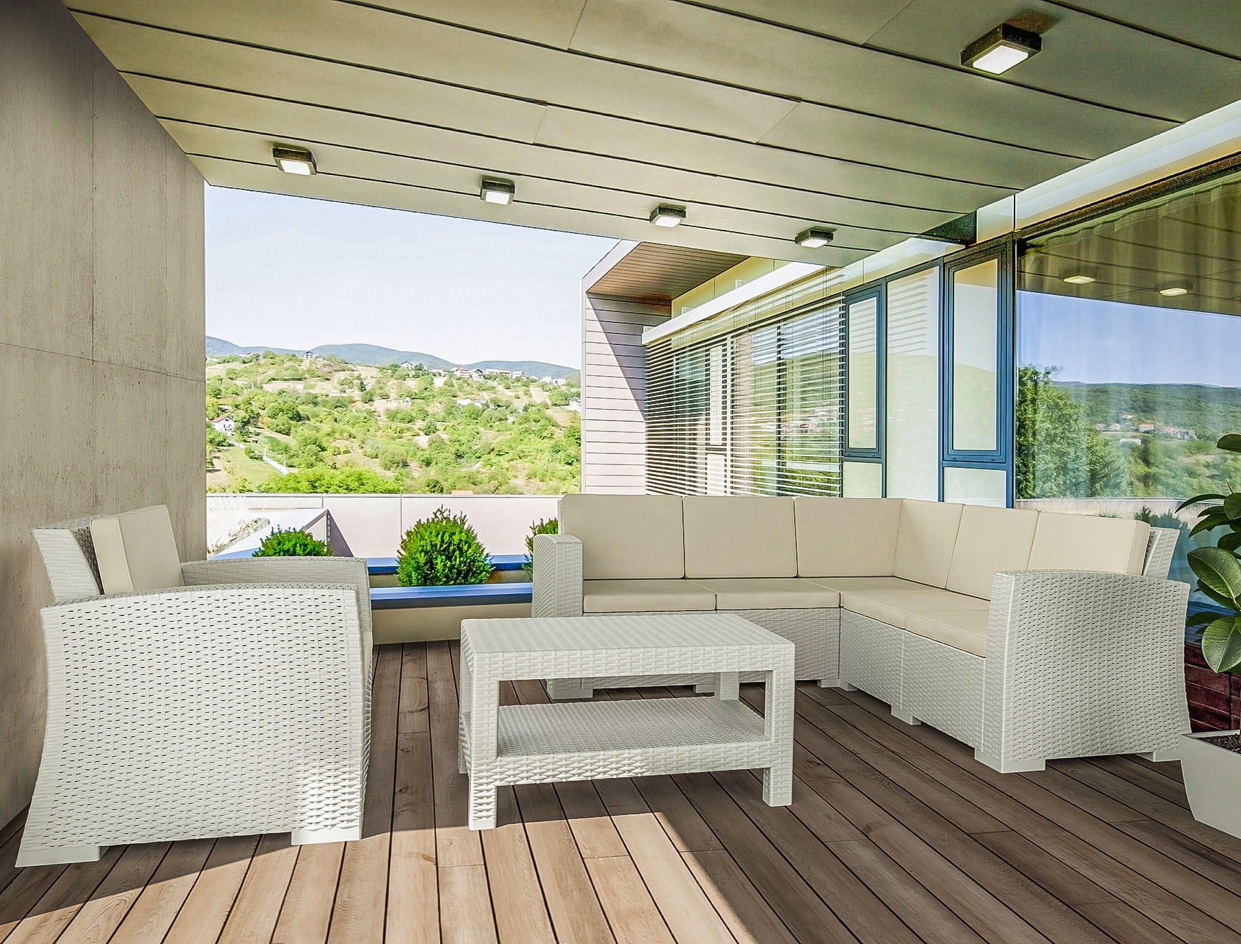 Meble wykonane są z odpornego na warunki atmosferyczne tworzywa imitującego wyglądem technorattan. Użyty materiał odporny jest na warunki atmosferyczne, w tym na promieniowanie UV.