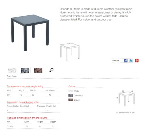 Wymiary: długość 80 cm, szerokość 80 cm, wysokość 75 cm.