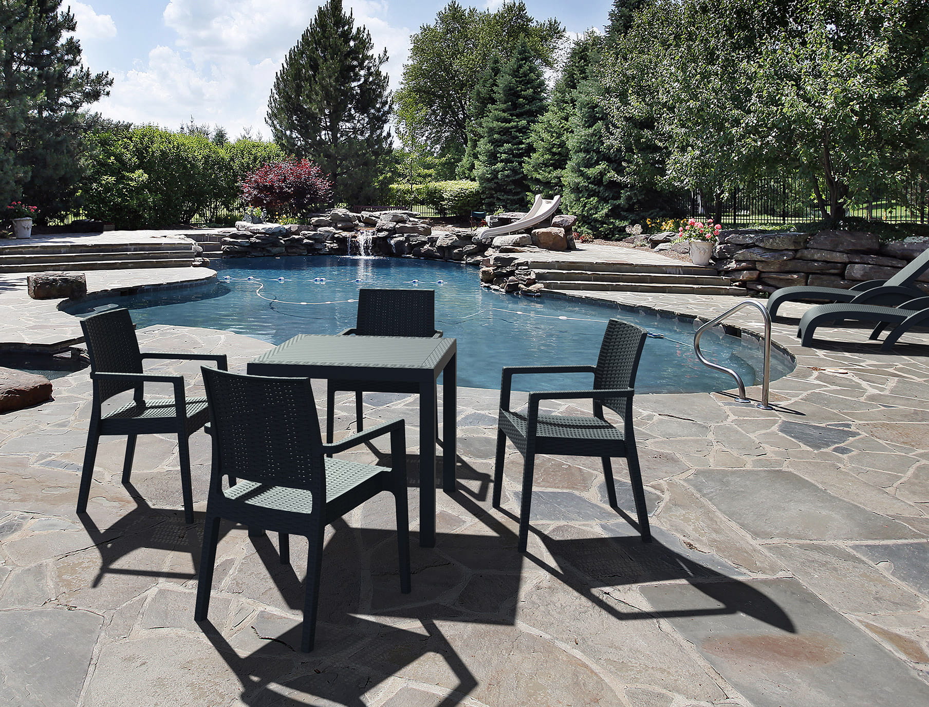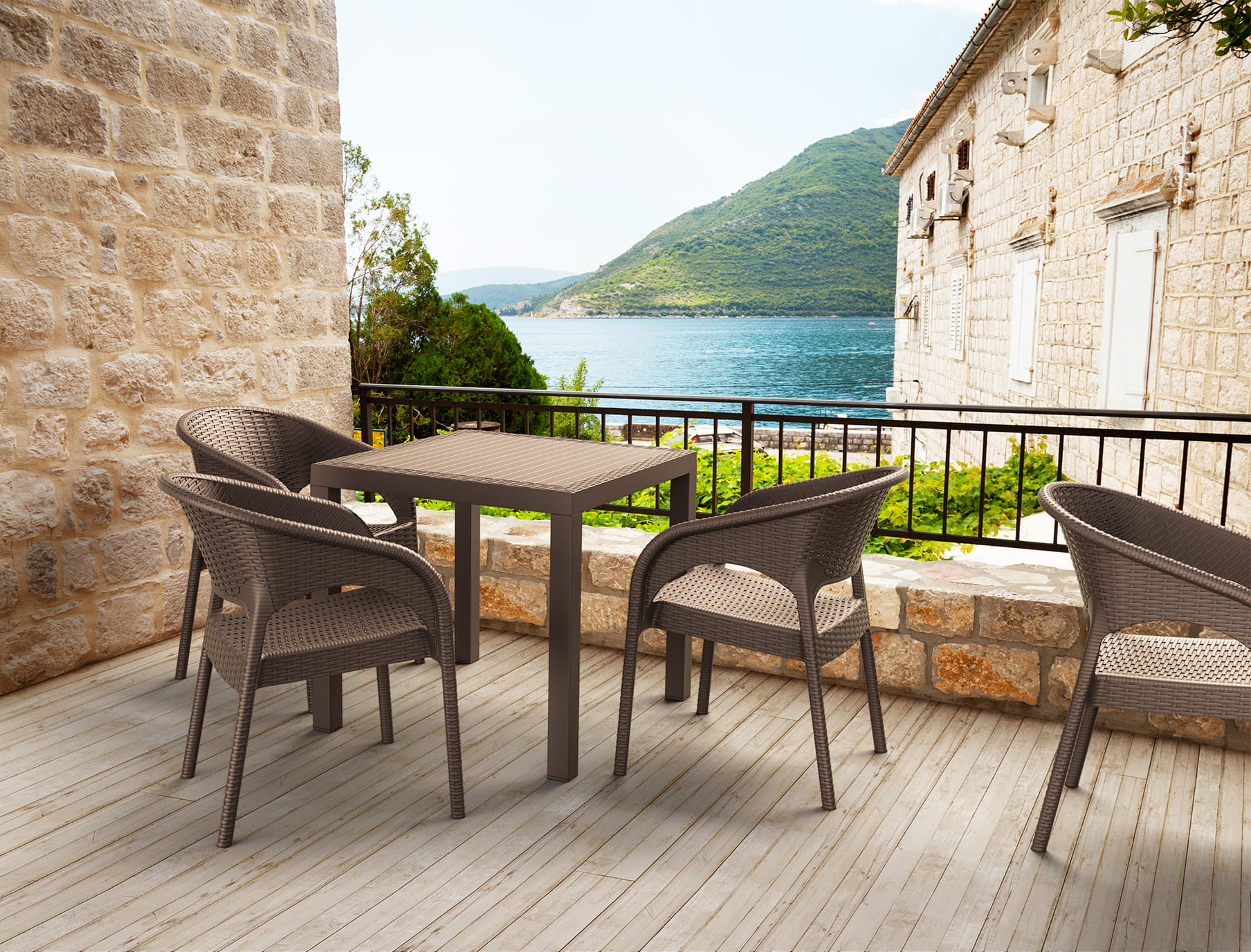 Stół Orlando z wysokiej klasy tworzywa imitującego technorattan. Świetnie nadaje się do użytku prywatnego w domu i ogrodzie jak i do kawiarni, restauracji.